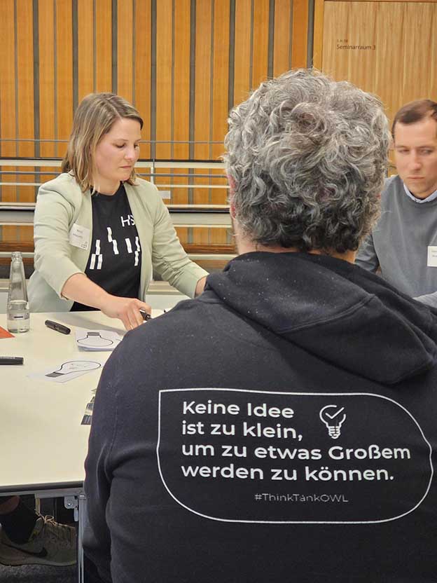 Die Veranstaltungsreihe „DenkBar“ führte in den letzten Monaten durch Herford, Minden, Detmold, Paderborn, Gütersloh und Bielefeld und richtete sich speziell an Unternehmerinnen aus der Region OWL. Bei jeder Veranstaltung wurden den Teilnehmenden zwei Beispiele erfolgreicher Kooperationen zwischen Wissenschaft und Wirtschaft präsentiert: GeschäftsführerInnen und BereichsleiterInnen regionaler Unternehmen gaben in Impulsvorträgen Einblicke in ihre positiven Erfahrungen mit dem Wissens- und Technologietransfer. In intensiven Kurzworkshops zu Themen wie ‚Hands on KI‘ (CircoVision UG), ‚In unsicheren Zeiten produktiv und innovativ Zukunft gestalten‘ (Rheingans GmbH) und ‚Transformation starten: Dein Wegweiser zu erfolgreicher Veränderung‘ (ThinkTank OWL), konnten die Teilnehmenden anschließend ihre eigenen Herausforderungen analysieren und erste Ideen entwickeln. Auf dieser Grundlage bot die MachBar die ideale Plattform, um UnternehmerInnen und Forschende zusammenzubringen, um Synergien zu schaffen und zukünftig gemeinsam innovative Lösungen zu erarbeiten.