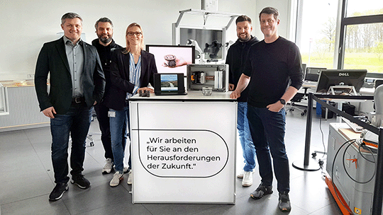 Die Hochschule und die Universität Bielefeld arbeiten gemeinsam an den Herausforderungen der Zukunft: (v. l. n. r.) Wilhelm Klat (Geschäftsführer CircoVision UG), Pedro Campos Silva (Projektleiter ThinkTank OWL), Dr. Cornelia Geukes (Geschäftsführerin IDaS, Hochschule Bielefeld ), Dr.-Ing. Marc Hesse und Dennis Quirin (CoR-Lab, Universität Bielefeld)