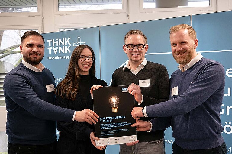 Das Gewinner-Team: (v.l.n.r). Abud Kamal Hamo, Ida Franziska Groß, Sven Nöcker (MEDIUM Werbeagentur GmbH) und Joel Bruns. ©ThinkTank OWL/ Lukas Stolle